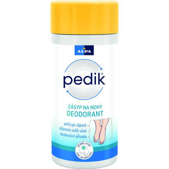 Popis : Alpa Pedik s obsahem účinné látky zinc ricinoleate váže pach, který vzniká při nadměrném pocení nohou.
