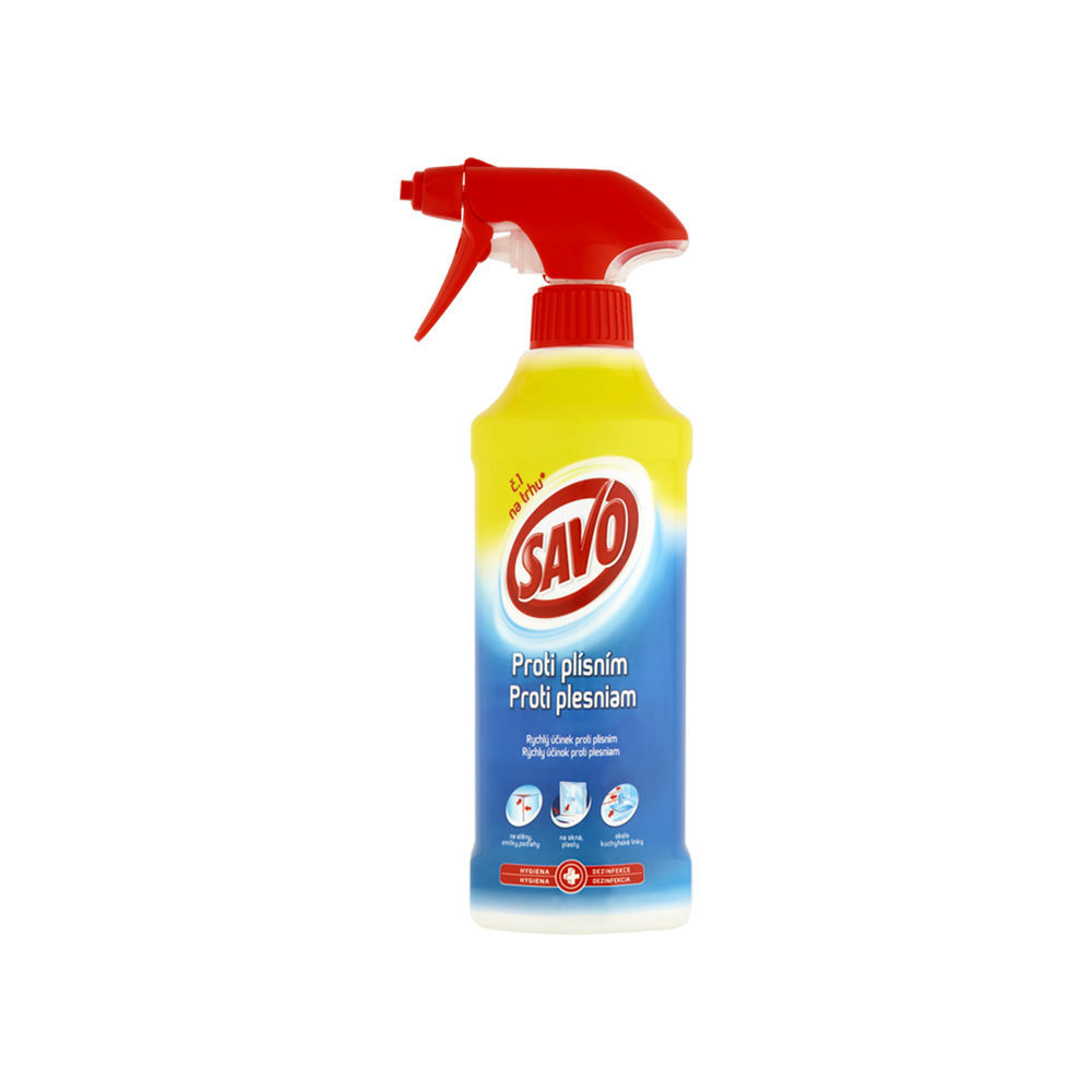 Popis : Savo PROTI PLÍSNÍM tekutý dezinfekční přípravek ve spreji účinně odstraňuje všechny druhy plísní a hub. Povrch vydezinfikuje a krásne vybělí. Můžete jej použít na různé povrchy: stěny, keramiku, obklady a spáry, omítky, zdivo, kámen, smalt, plasty, akrylátové povrchy, silikon, guma, nerez. Praktický mechanický rozprašovač vám zaručí snadnou manipulaci a přístup i k těžce dostupným místům.